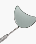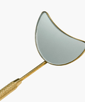 A unique moon shape mirror rest perfectly on the client's under-eye or cheek, offering a full and unobstructed view of the lashes.