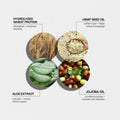 Ingredients: Aqua, PVP, Polysorbate 20, Glycerol, Polyvinyl Alcohol, Cetearyl Alcohol, DL-1, 2-Hexanediol, Hydrolyzed Wheat Protein, Hemp Seed Oil, Coconut Oil, Jojoba Oil, Aloe Extract.